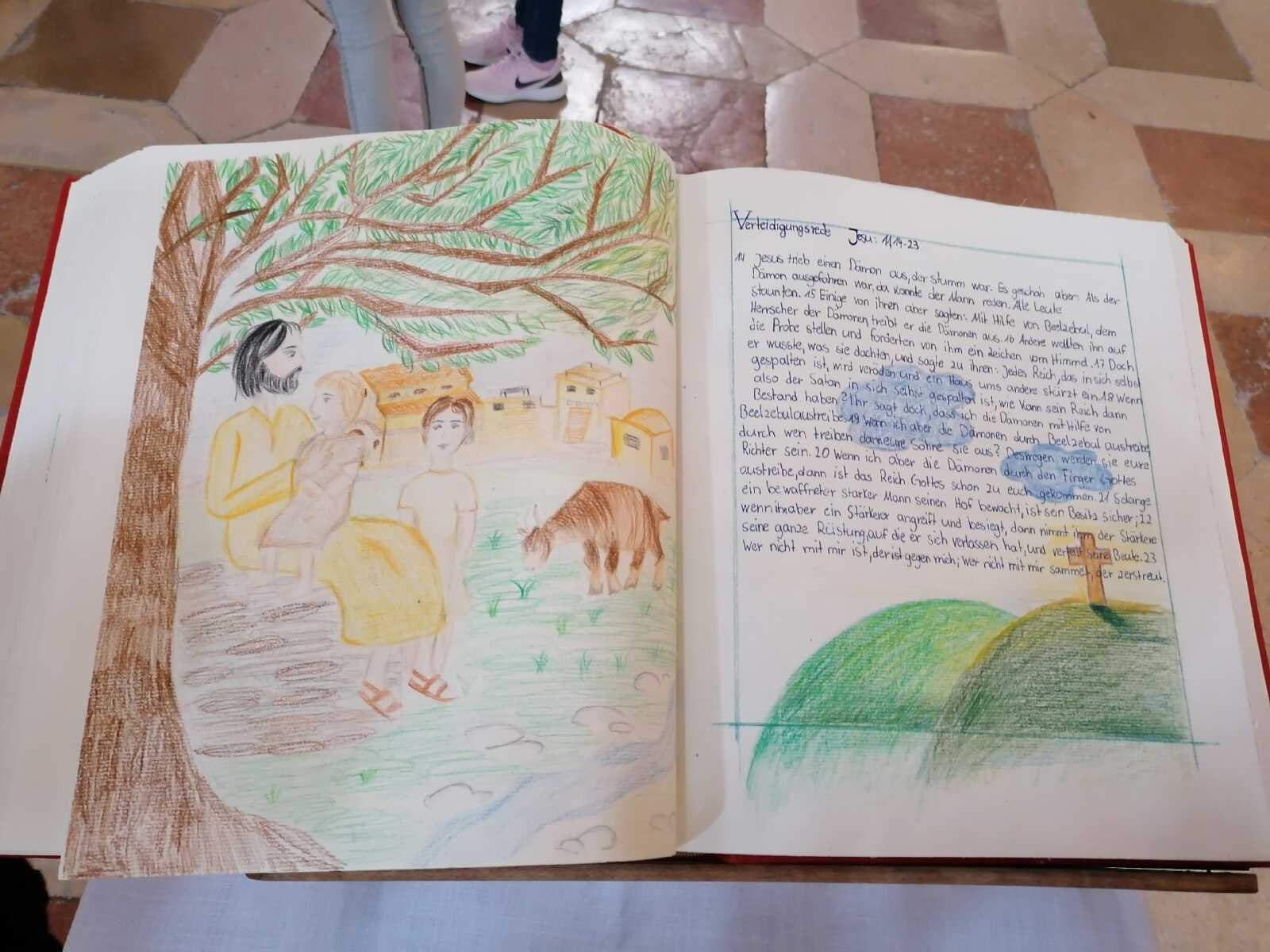 Am 19. Mai fuhr Fr. Blüml zusammen mit Ida S. und Johanna J. nach Passau in den Dom zur Segnung der Kinderbibel. Bei diesem Projekt durften Kinder mehrerer Schulen die Bibel per Hand abschreiben und verzieren. Anschließend wurde daraus die „Heilig.Schüler.Schrift“ gebunden. Diese wurde an diesem Tag feierlich mit einem Gottesdienst geweiht. Den Gottesdienst hielt Bischof Stefan Oster. Diese Bibel wird in den nächsten Monaten auf Wanderschaft gehen. Jede Schule, die an diesem Projekt mitgeschrieben hat, wird die Bibel einige Zeit in Obhut nehmen dürfen. Wir sind schon sehr gespannt, wann wir die schöne Bibel in Empfang nehmen dürfen.