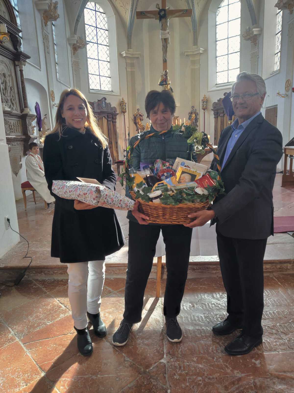 Im Rahmen des Ostergottesdienstes wurde die langjährige Reinigungskraft Maria Baumgärtner in den wohlverdienten Ruhestand verabschiedet. Die Schulleiterin, Kerstin Bauer, und der Trägervereinsvorsitzende, Josef Steiner, bedankten sich mit einem Geschenkkorb bei ihr.