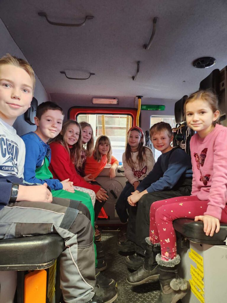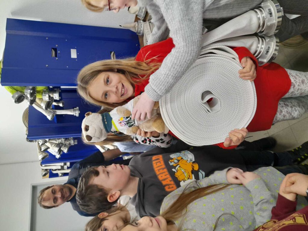 Zwischendurch stärkten sich die Kinder noch im Gemeinschaftsraum der Feuerwehr und der ein oder andere äußerte schon den Wunsch, dass er auch als Erwachsener hier seine Brotzeit als Feuerwehrmann oder Feuerwehrfrau genießen will. Die Schlauchwaschanlage war besonders beeindruckend für die Kinder. Als Höhepunkt durften sich die Schüler*innen die Feuerwehrautos von Innen ansehen und wurden mit Blaulicht und Sirene zurück in die Schule gefahren.