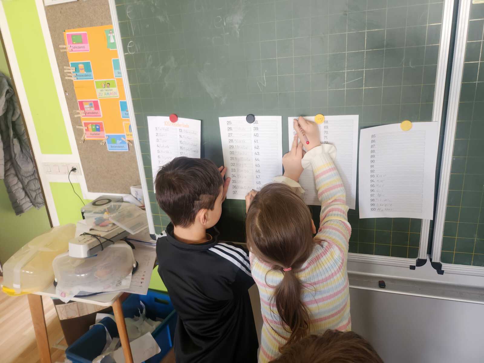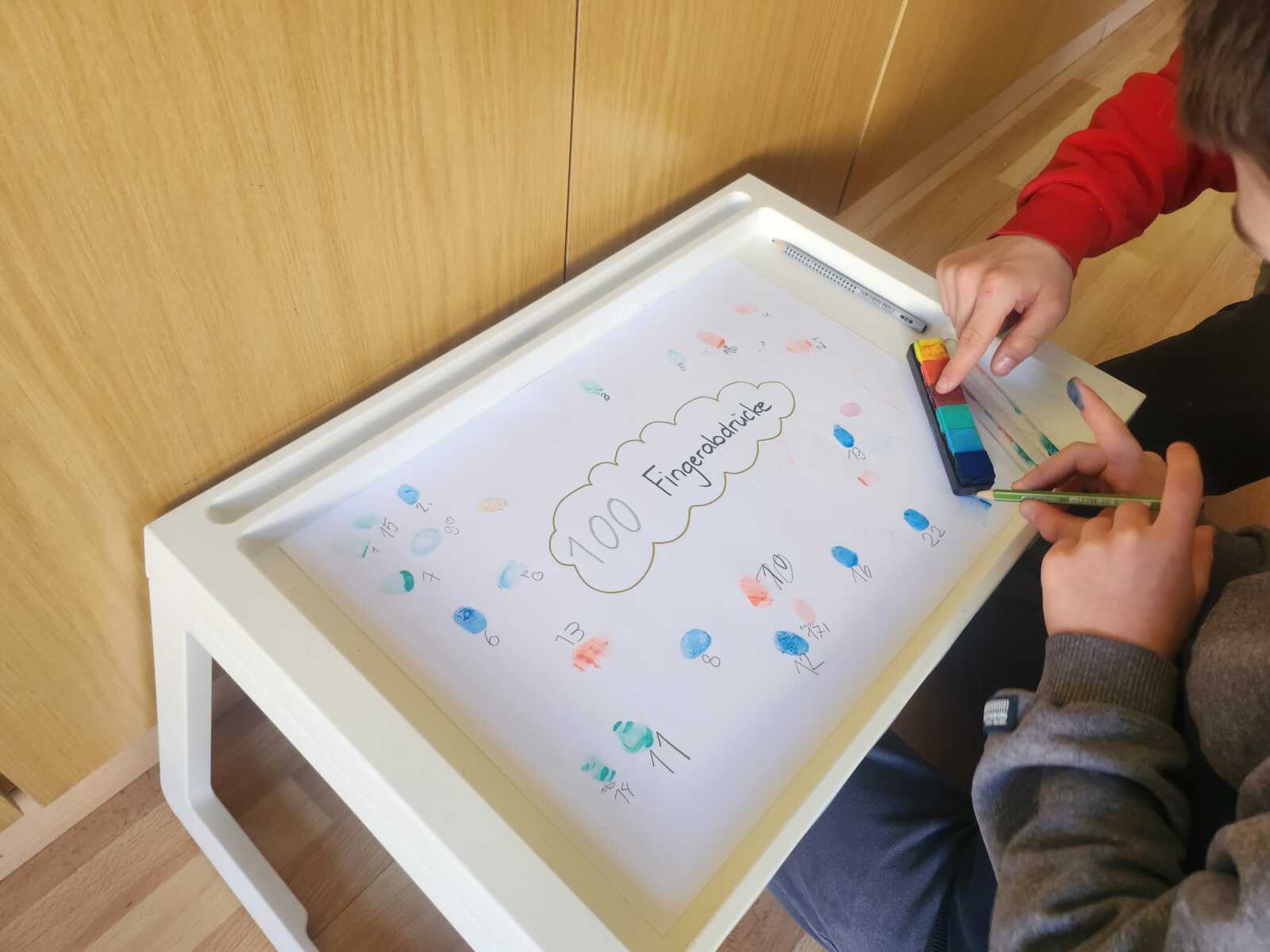 Gemeinsam haben wir verschiedene Stationen gemacht. Wir haben 100 Namen gesucht, 100 Fingerabdrücke gesammelt, 100 Wörter zusammengetragen und uns überlegt, wie wir wohl mit 100 Jahren aussehen werden.